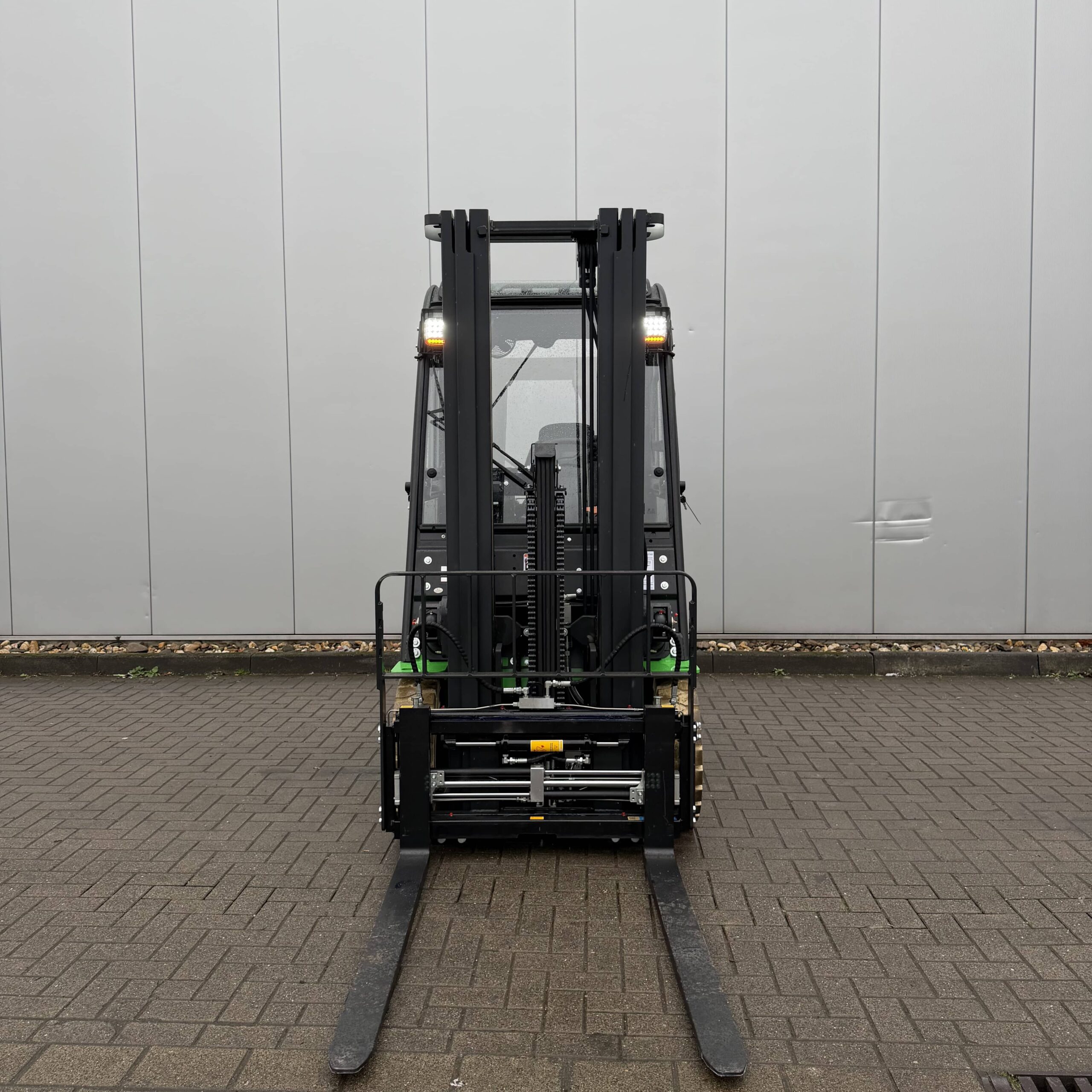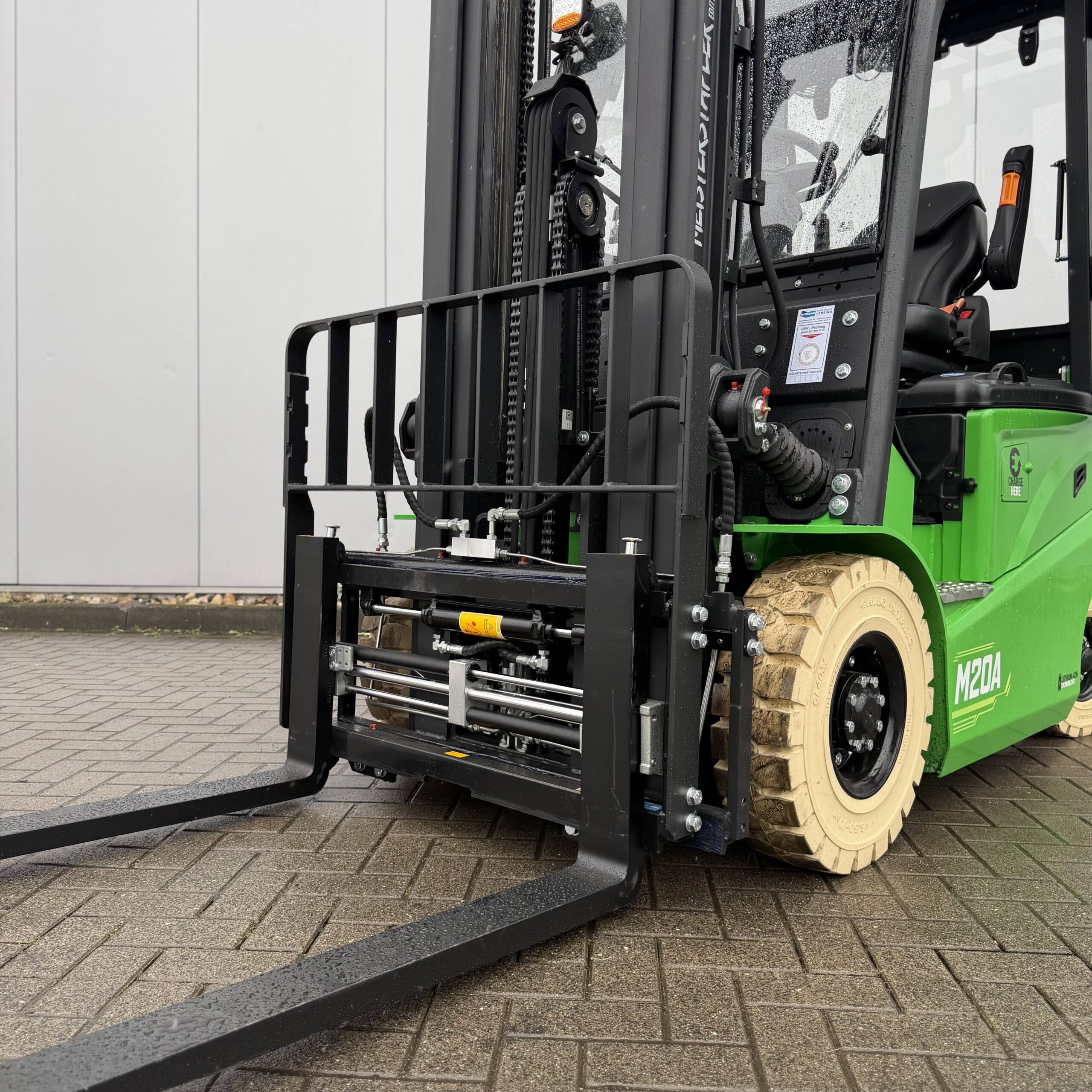 Integrierte Zinkenverstellung & Seitenschieber: Absolute Flexibilität bei der Lastaufnahme ohne manuelles Absteigen.