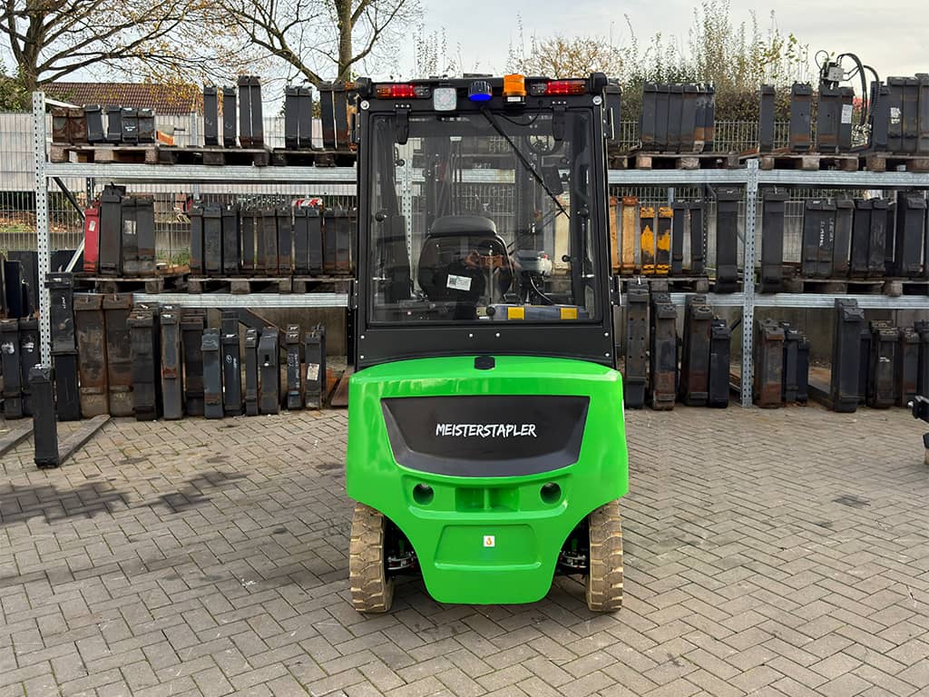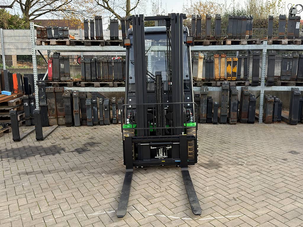 | Ausstattung | 1.200 mm Zinken, 3. und 4. Ventil, Batterie Heizsystem, Bluespot, Externes Ladegerät, Fingertip Steuerung, LCD-Display, LED Beleuchtung, Nicht kreidende Reifen, Seitenschieber, Triplex Mast, Vollkabine mit Heizung |