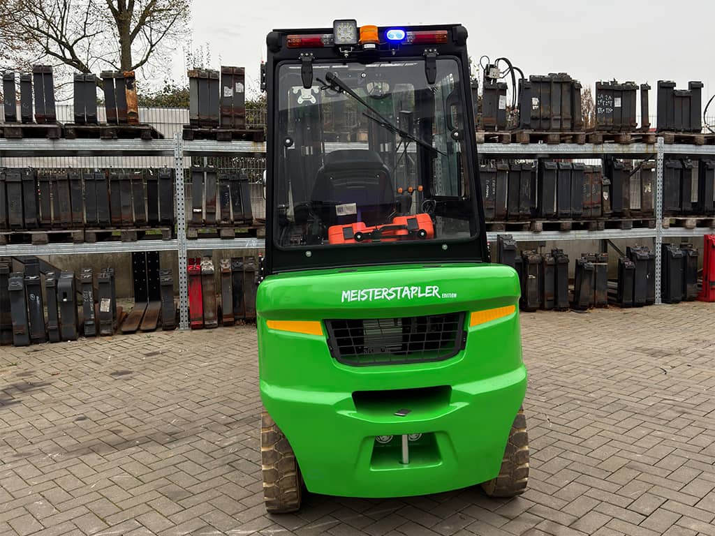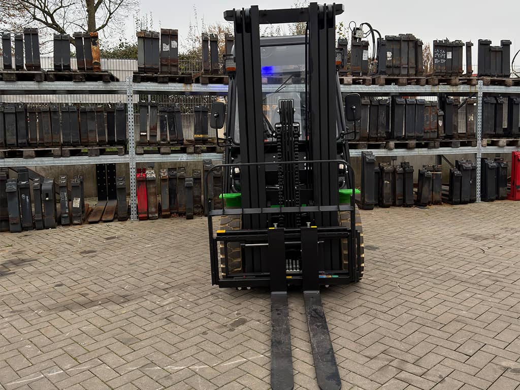 | Ausstattung | 1.200 mm Zinken, 3. und 4. Ventil, Batterie Heizsystem, Bluespot, Internes Ladegerät, LCD-Display, LED Beleuchtung, Nicht kreidende Reifen, Seitenschieber, Triplex Mast, Vollkabine mit Heizung |