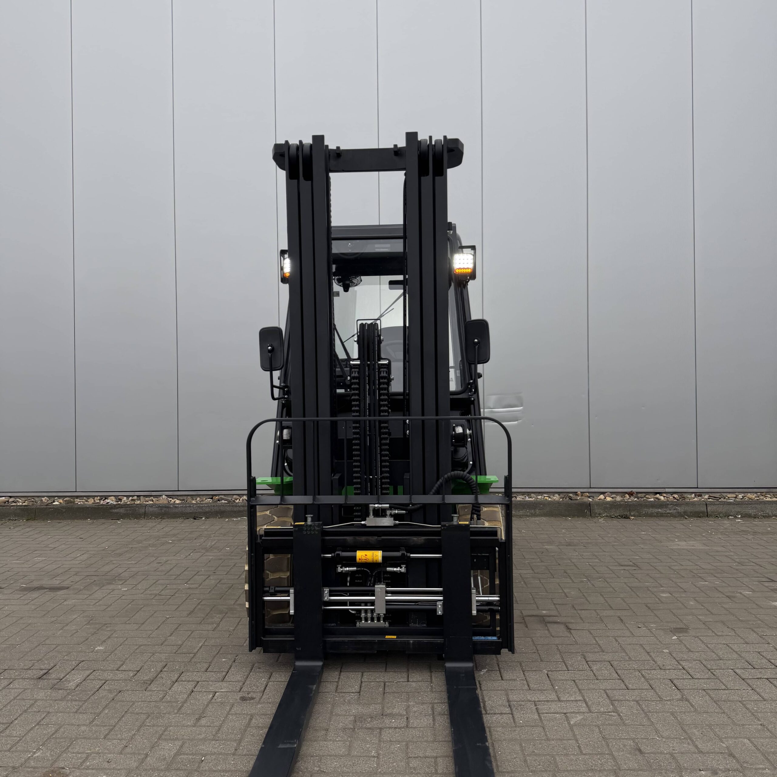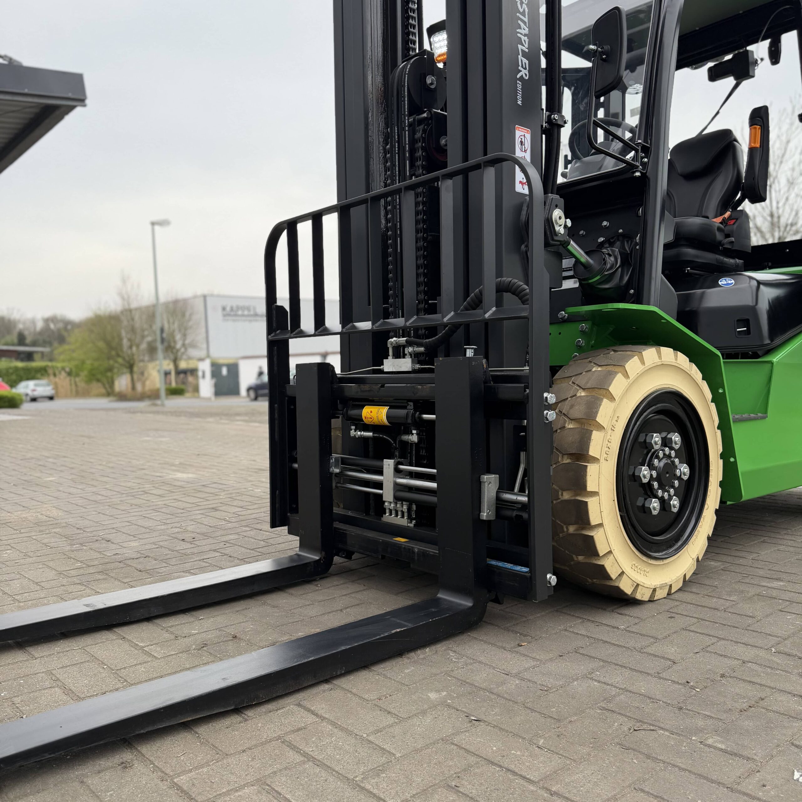 Integrierte Zinkenverstellung & Seitenschieber: Absolute Flexibilität bei der Lastaufnahme ohne manuelles Absteigen.