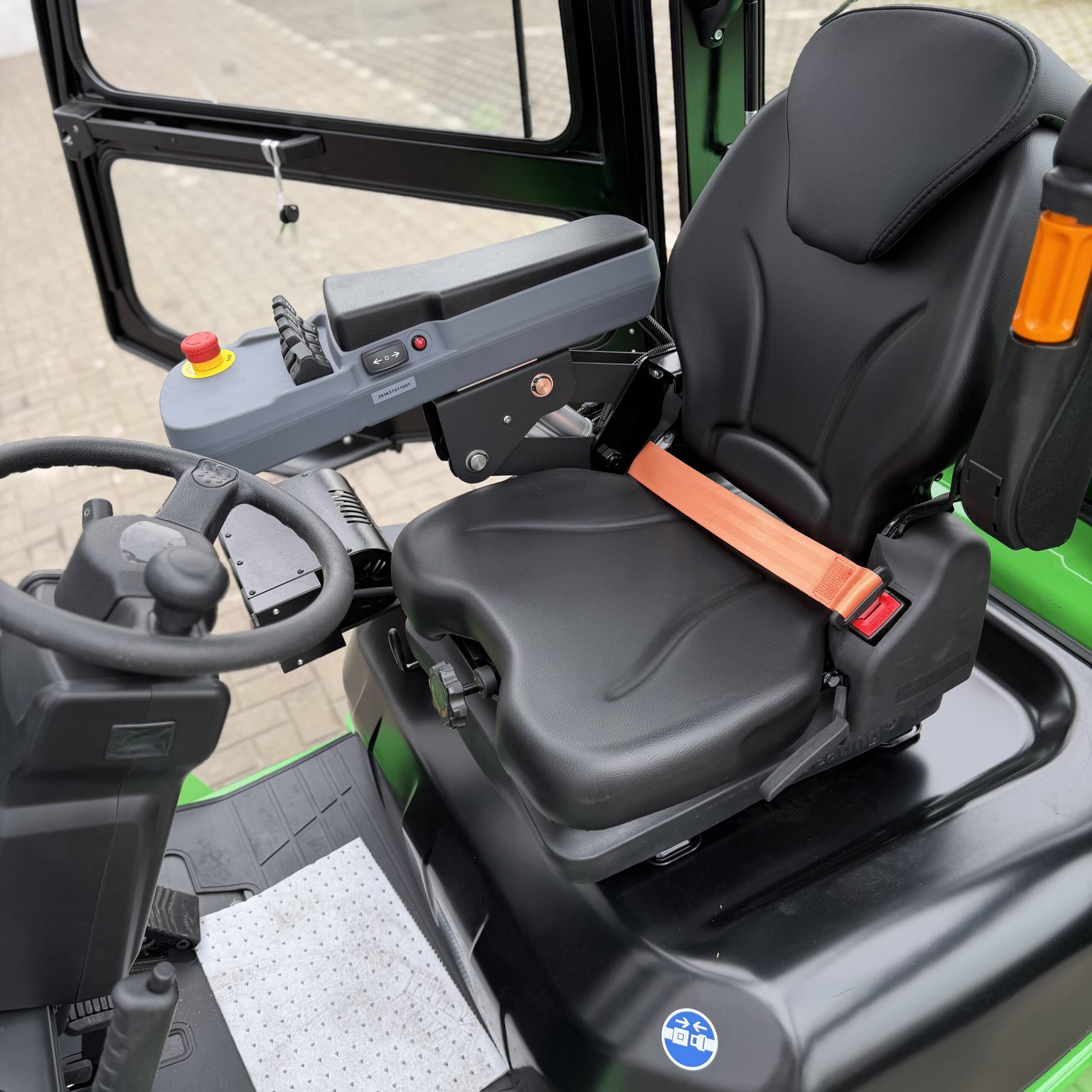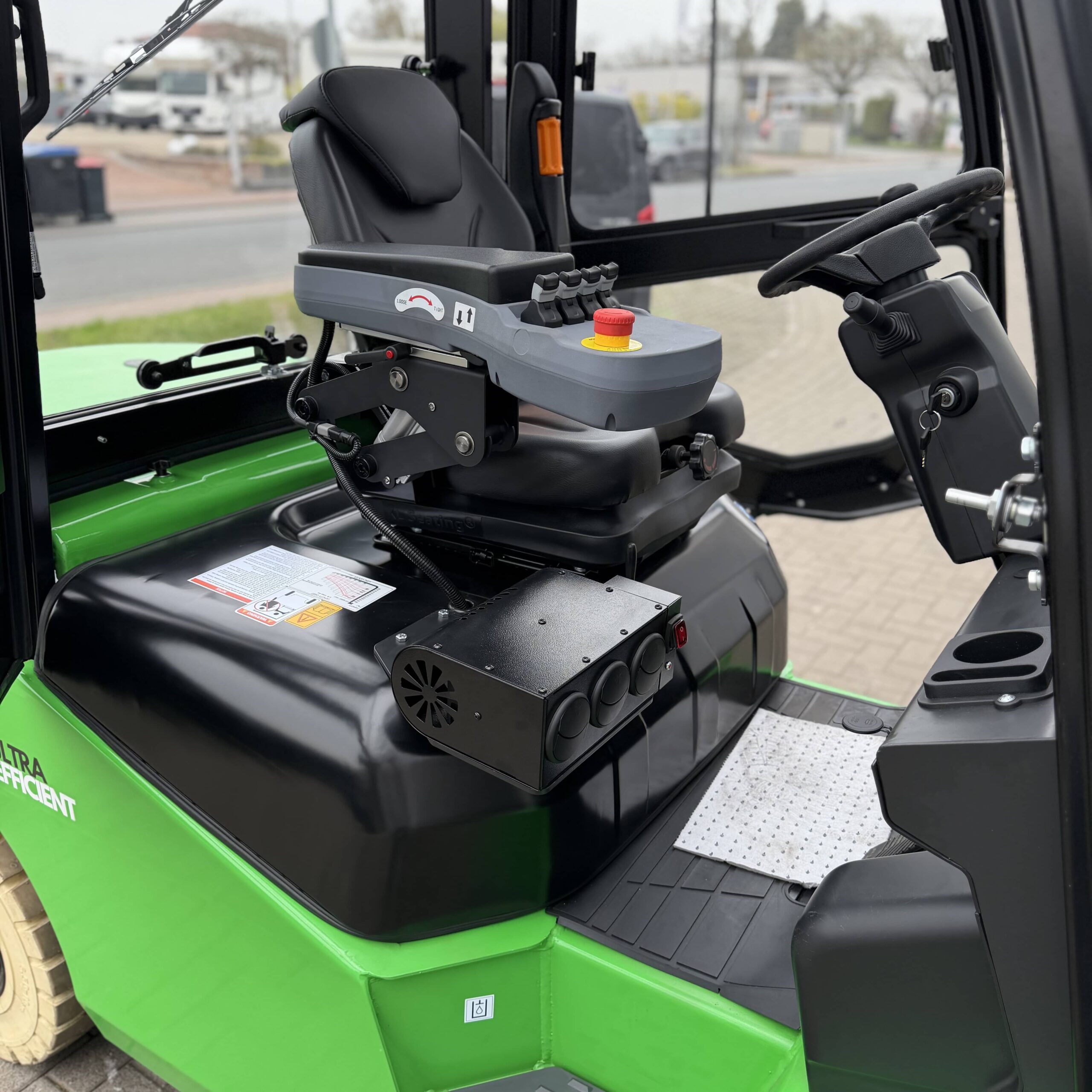 | Ausstattung | 1.200 mm Zinken, 3. und 4. Ventil, Batterie Heizsystem, Bluespot, Externes Ladegerät – (80V / 100A), Fingertip Steuerung, LCD-Display, LED Beleuchtung, Nicht kreidende Reifen, Seitenschieber, Triplex Mast, Vollkabine mit Heizung, Zinkenverstellung |