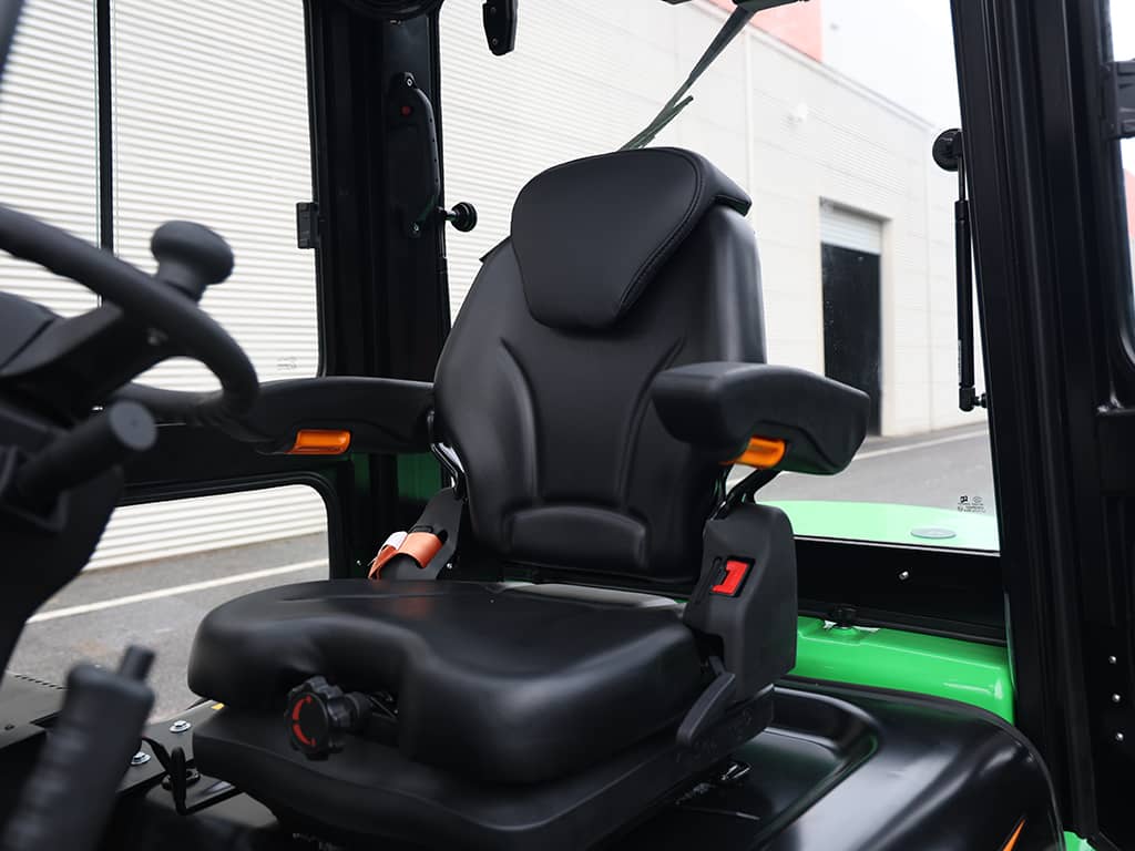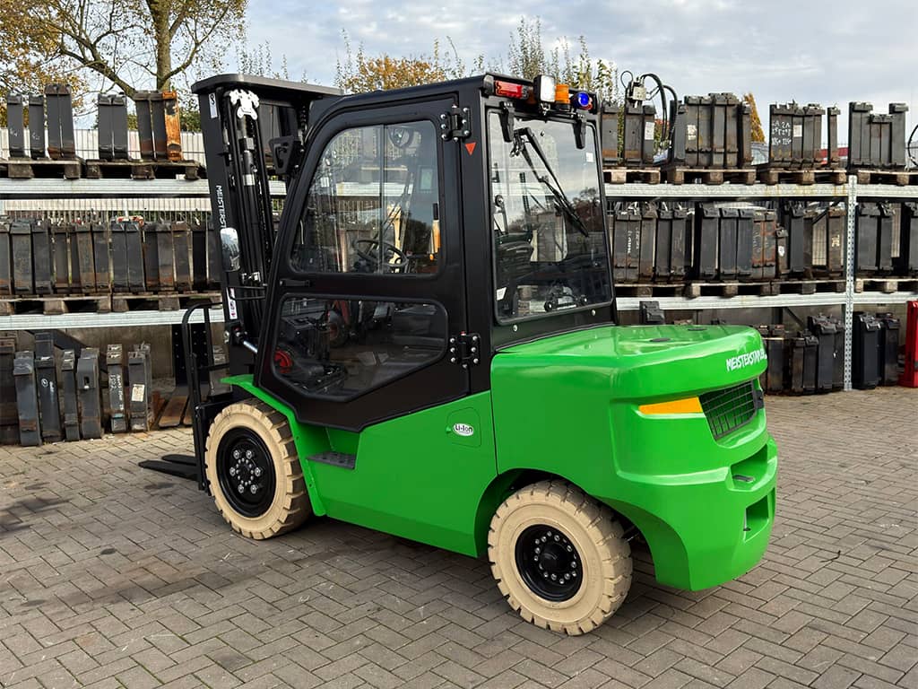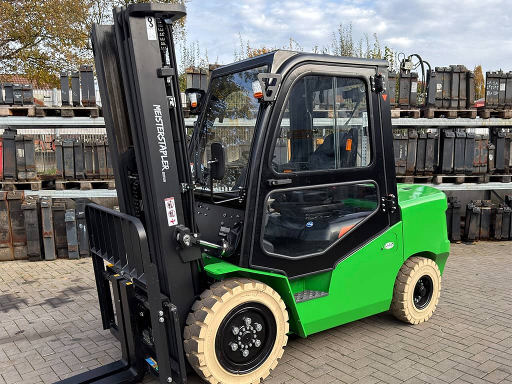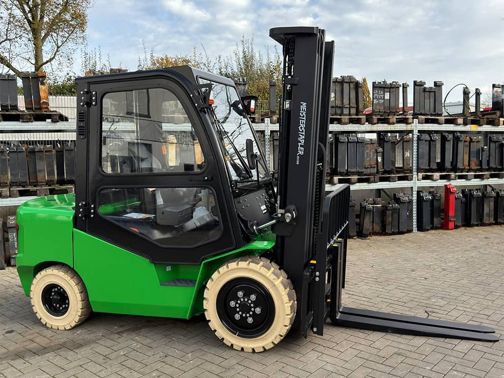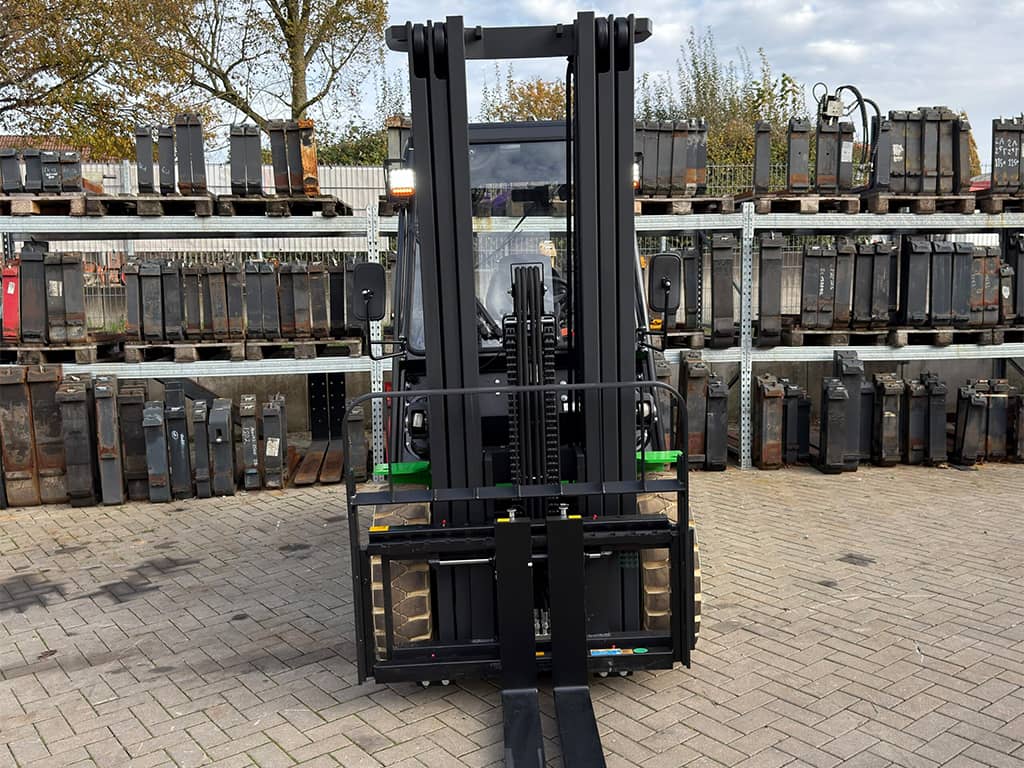 | Ausstattung | 1.200 mm Zinken, 3. und 4. Ventil, Batterie Heizsystem, Bluespot, Internes Ladegerät, LCD-Display, LED Beleuchtung, Nicht kreidende Reifen, Seitenschieber, Triplex Mast, Vollkabine mit Heizung |